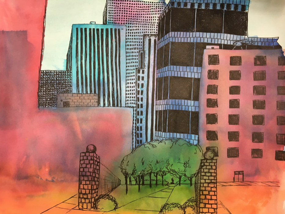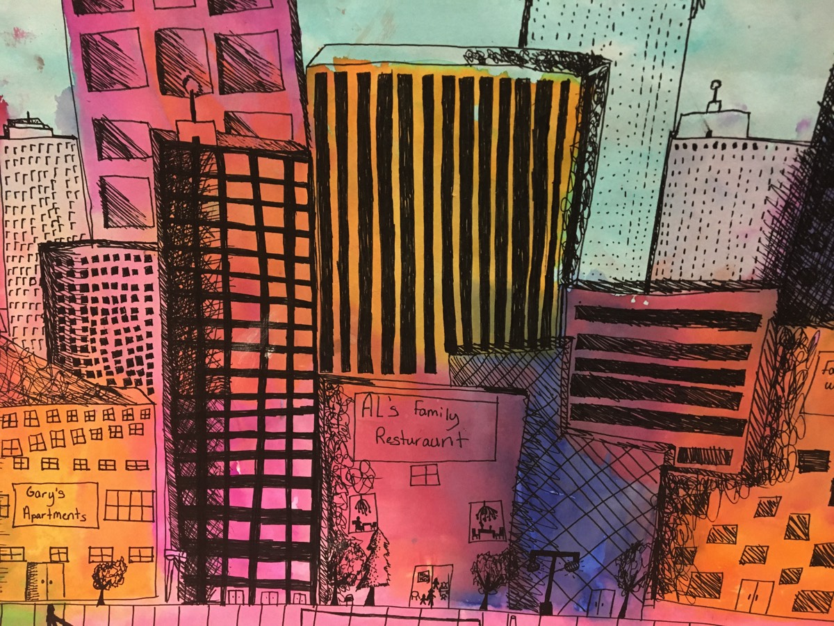 Use black ink or Sharpie to draw bold building shapes with strong outlines and flat fill.