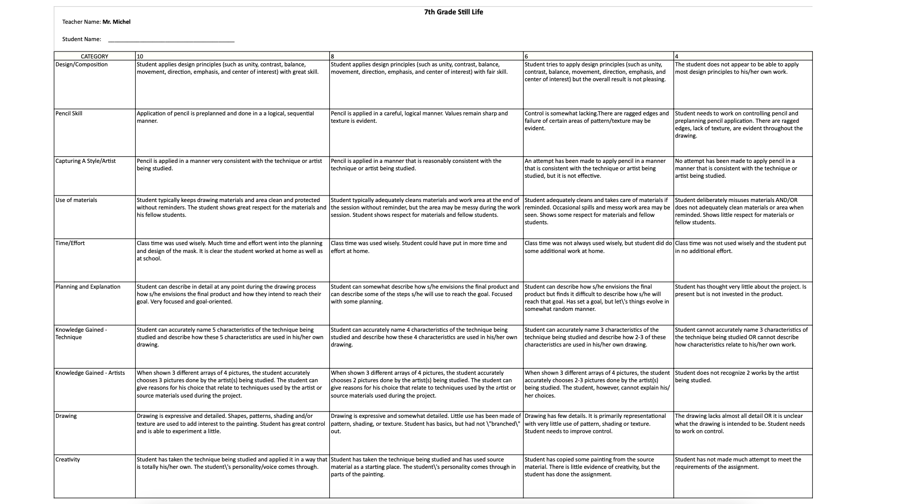 Rubrics have become popular with teachers as a means of communicating expectations for an assignment, providing focused feedback on works in progress, and grading final products. A rubric is a document that articulates the expectations for an assignment by listing the criteria, or what counts, and describing levels of quality from excellent to poor.