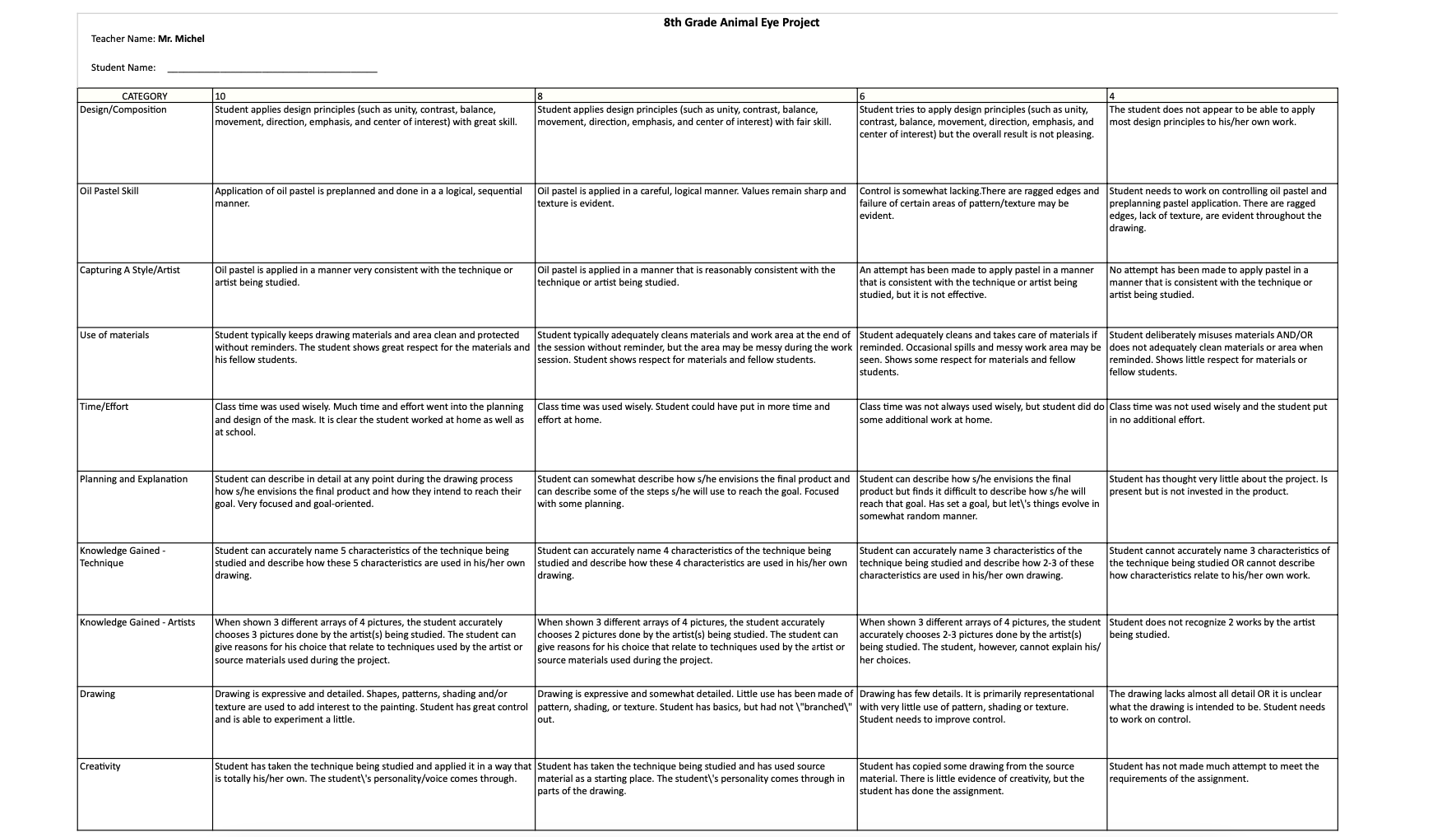 Rubrics have become popular with teachers as a means of communicating expectations for an assignment, providing focused feedback on works in progress, and grading final products. A rubric is a document that articulates the expectations for an assignment by listing the criteria, or what counts, and describing levels of quality from excellent to poor.