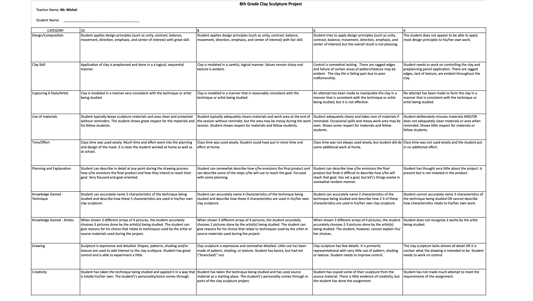 Rubrics have become popular with teachers as a means of communicating expectations for an assignment, providing focused feedback on works in progress, and grading final products. A rubric is a document that articulates the expectations for an assignment by listing the criteria, or what counts, and describing levels of quality from excellent to poor.