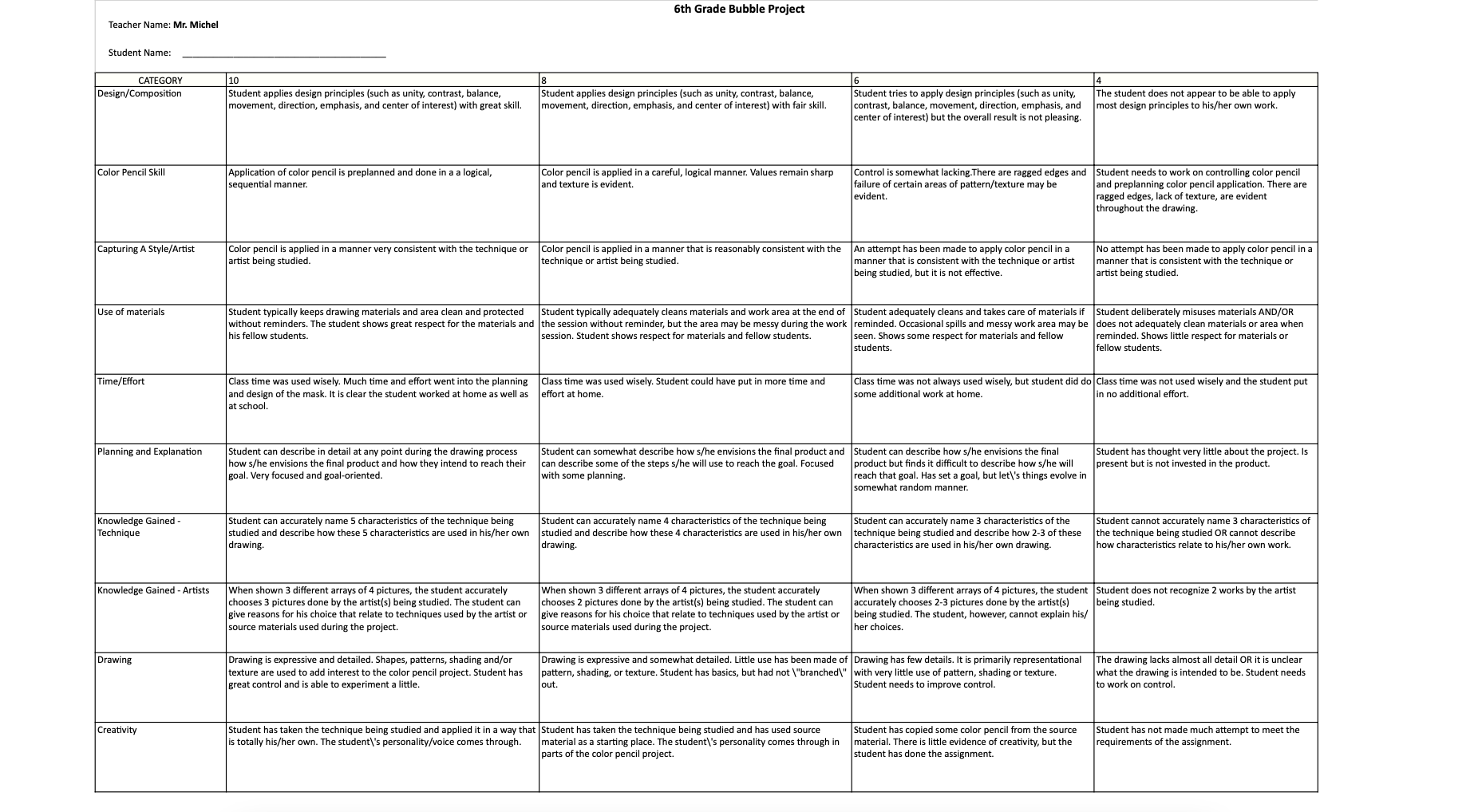 Rubrics have become popular with teachers as a means of communicating expectations for an assignment, providing focused feedback on works in progress, and grading final products. A rubric is a document that articulates the expectations for an assignment by listing the criteria, or what counts, and describing levels of quality from excellent to poor.
