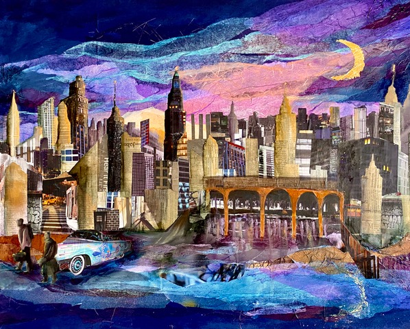 Cut buildings from black construction paper to get clean, crisp edges, then glue onto the background.