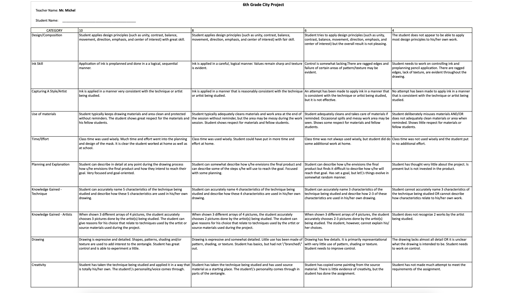 Rubrics have become popular with teachers as a means of communicating expectations for an assignment, providing focused feedback on works in progress, and grading final products. A rubric is a document that articulates the expectations for an assignment by listing the criteria, or what counts, and describing levels of quality from excellent to poor.